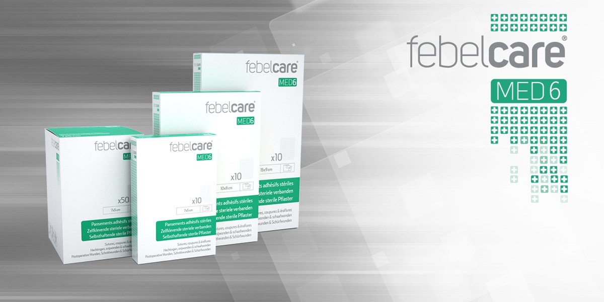Aujourd’hui, nous sommes ravis de vous présenter la dernière addition à notre gamme de produits de traitement des plaies : Febelcare MED6. Il s’agit d’un pansement en non-tissé hypoallergénique et sans latex qui s’utilise essentiellement en cas de sutures, coupures et éraflures. La gamme est composée de quatre boîtes différentes.