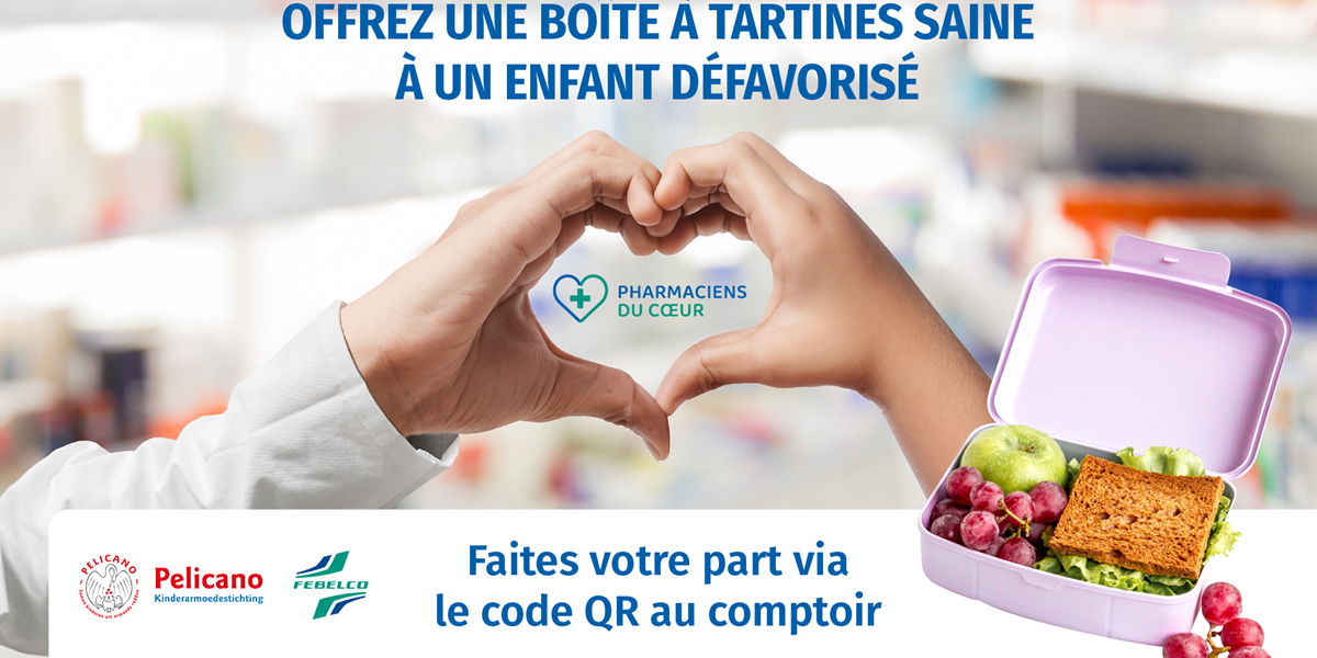 Dans le cadre de l’initiative « Pharmaciens du Cœur », 300 pharmaciens en Flandre, à Bruxelles et en Wallonie se sont engagés à offrir un repas sain aux élèves dans le besoin. Du 4 au 29 novembre, les patients peuvent faire un don libre lorsqu’ils se rendent dans une pharmacie participante. Le montant minimal est de 1 € et le paiement s’effectue par voie électronique ou, en espèces dans une tirelire.