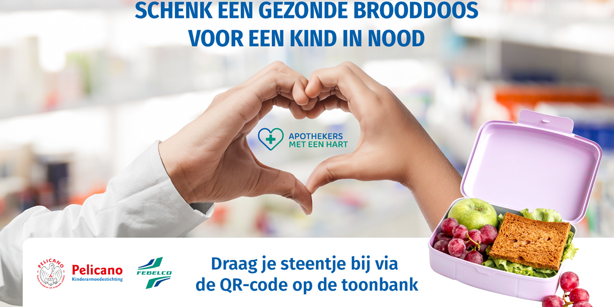 Onder de noemer ‘Apothekers met een hart’ engageren 300 apothekers in Vlaanderen, Brussel en Wallonië zich voor een gezonde lunch bij scholieren. Van 4 tot en met 29 november kunnen patiënten bij een apotheekbezoek een vrije bijdrage doen. Storten kan al vanaf €1 en gebeurt elektronisch of via de ouderwetse spaarpot.